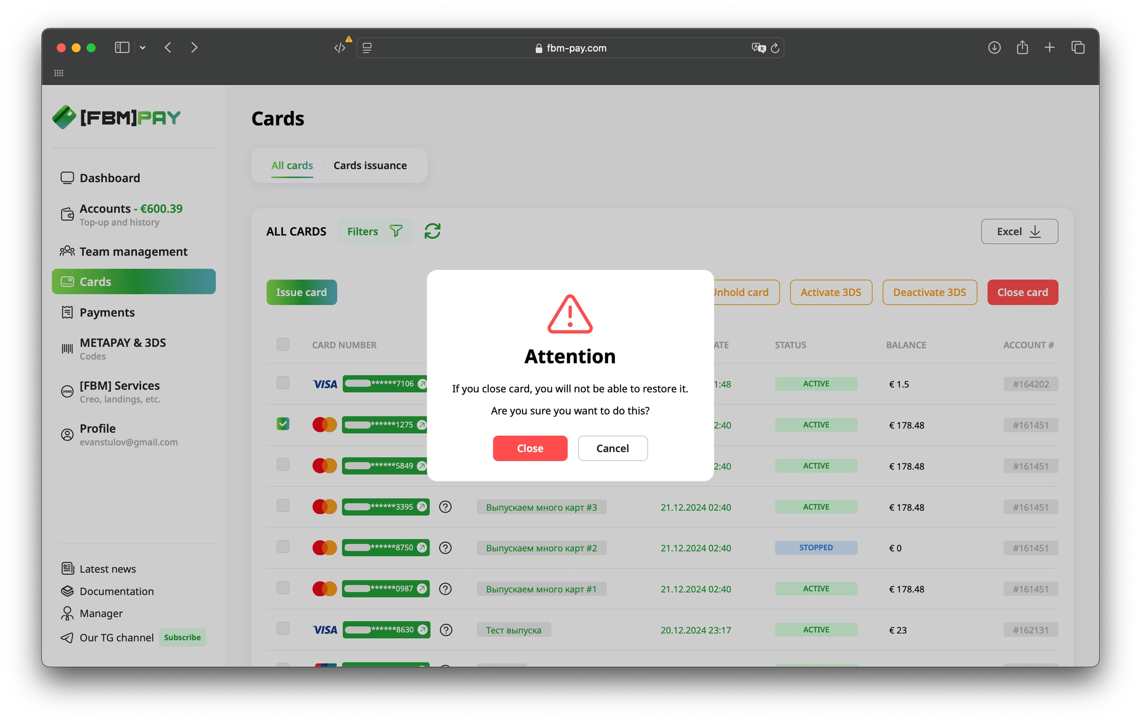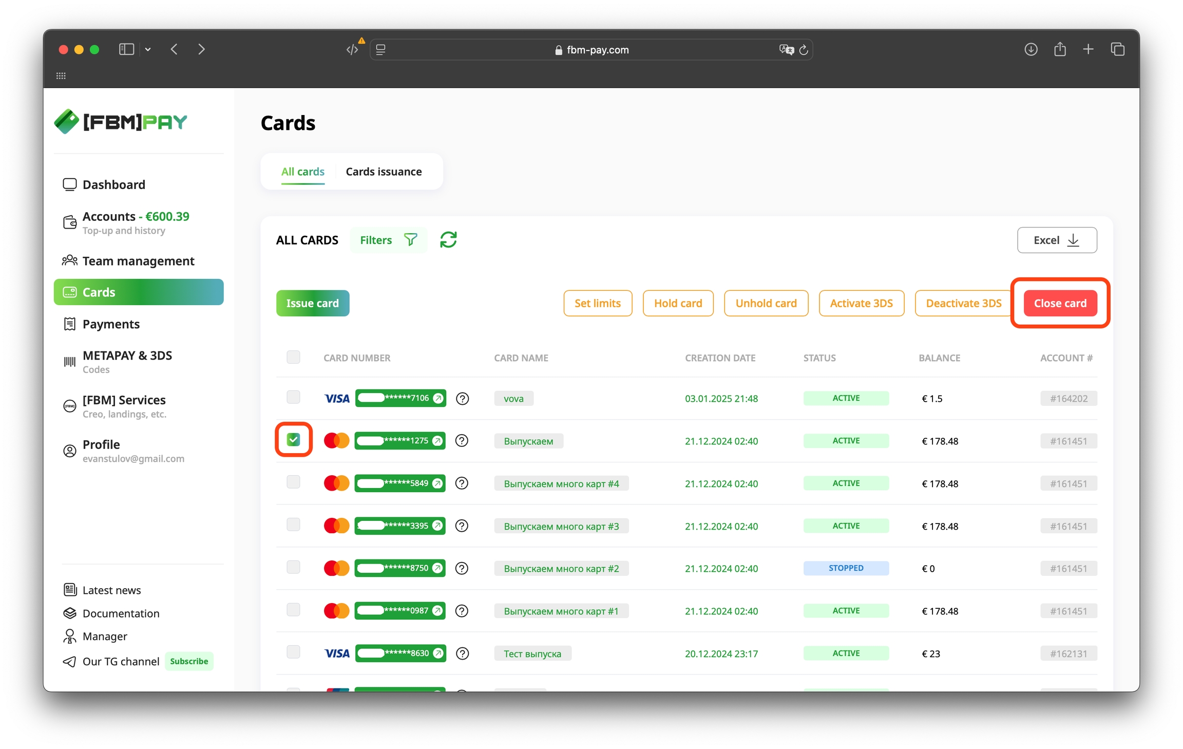 Go to the section Cards, select the appropriate card and click on the "Close card" button at the top of the work area.
