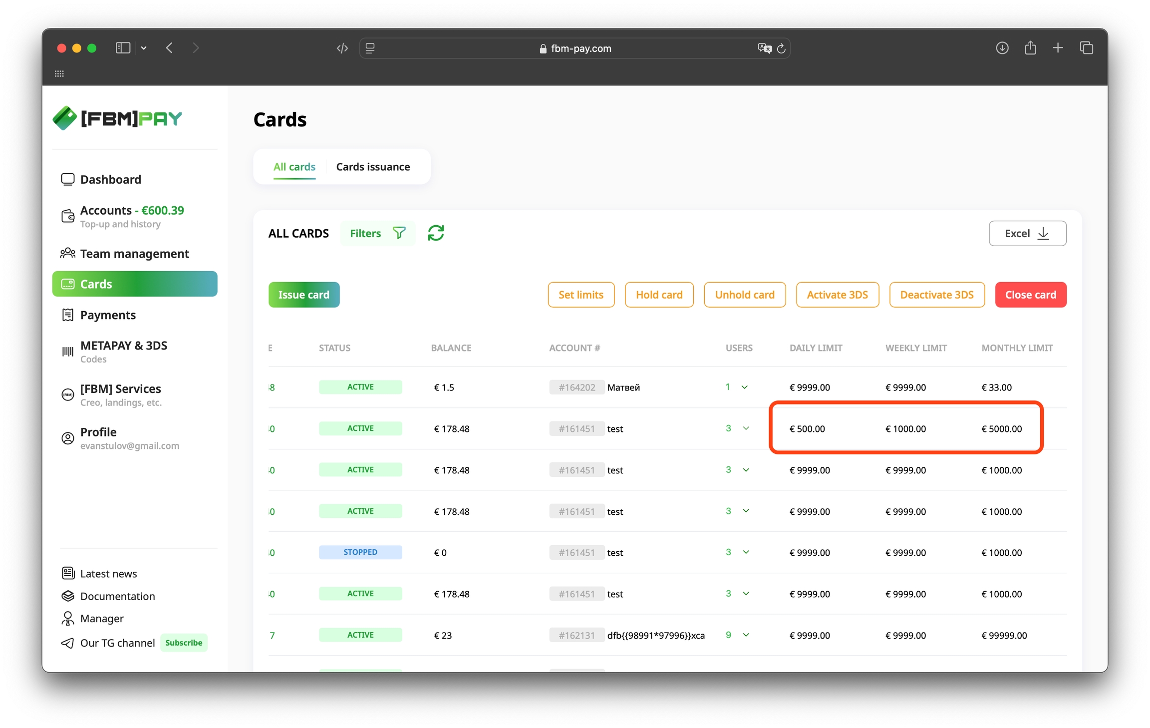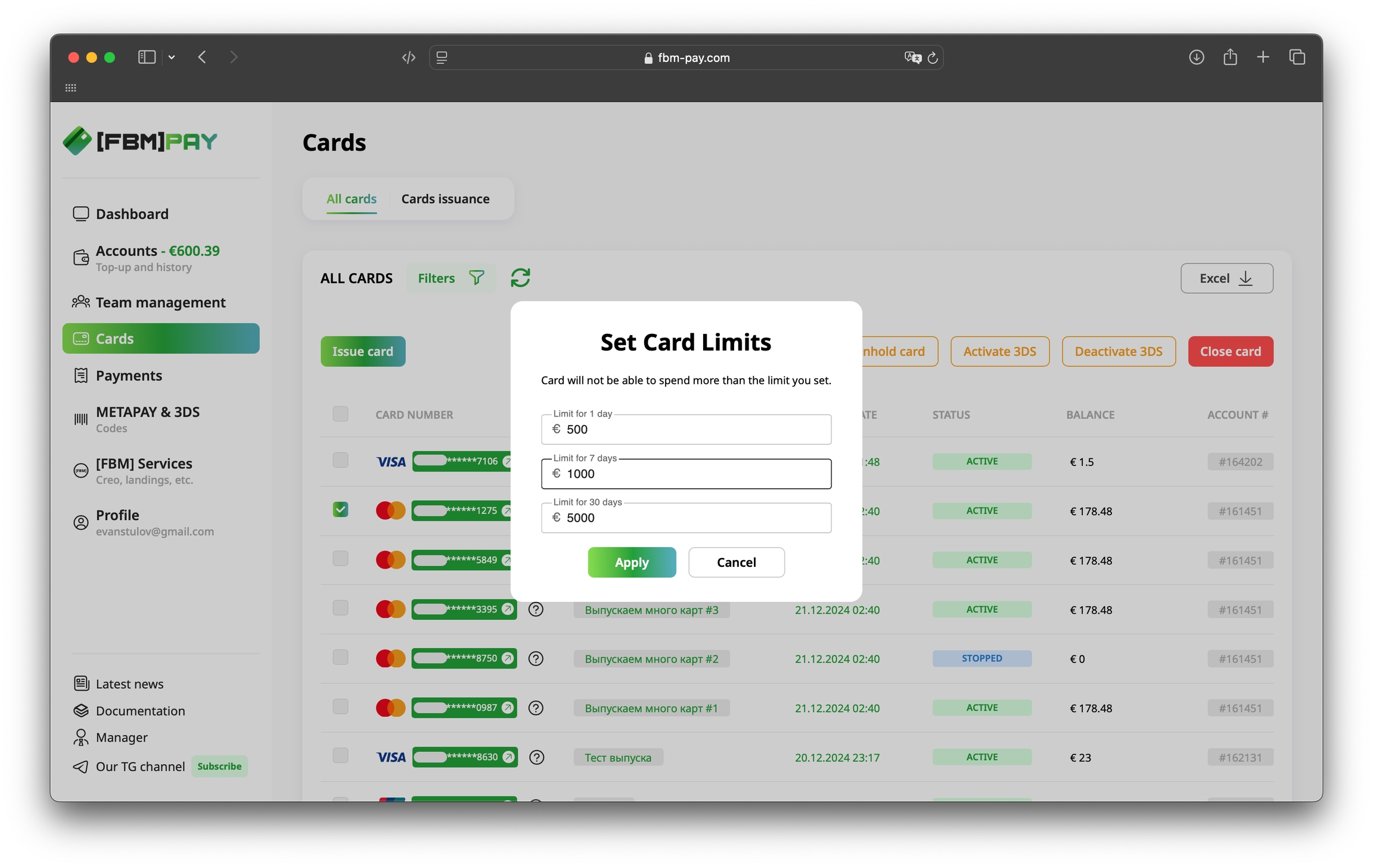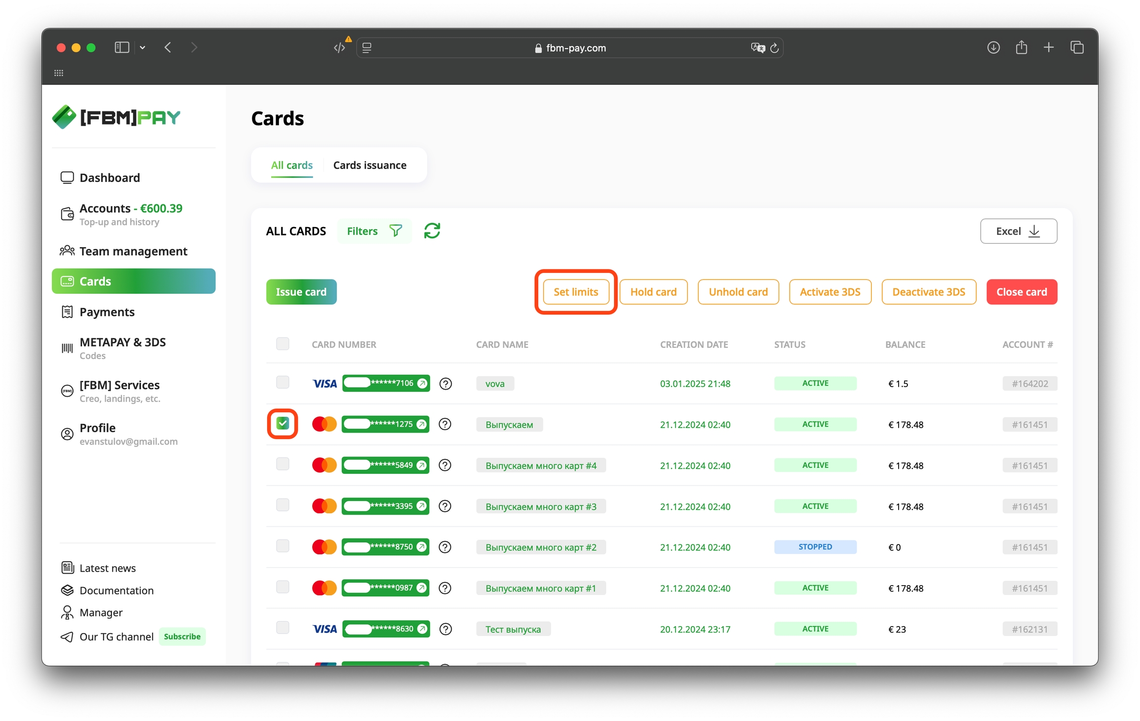 Go to the section Cards, select the appropriate card and click on the "Set limits" button at the top of the work area.