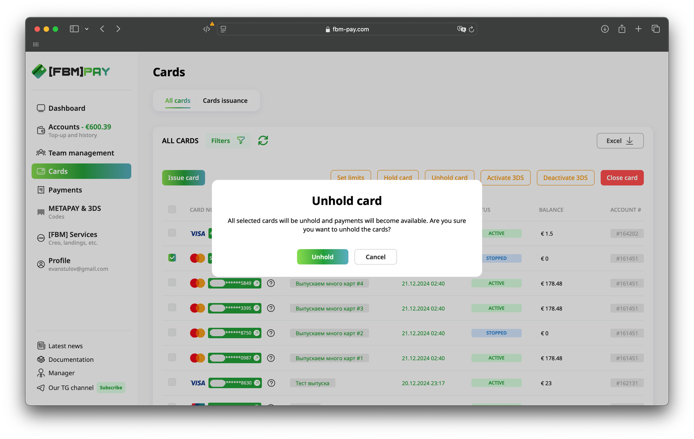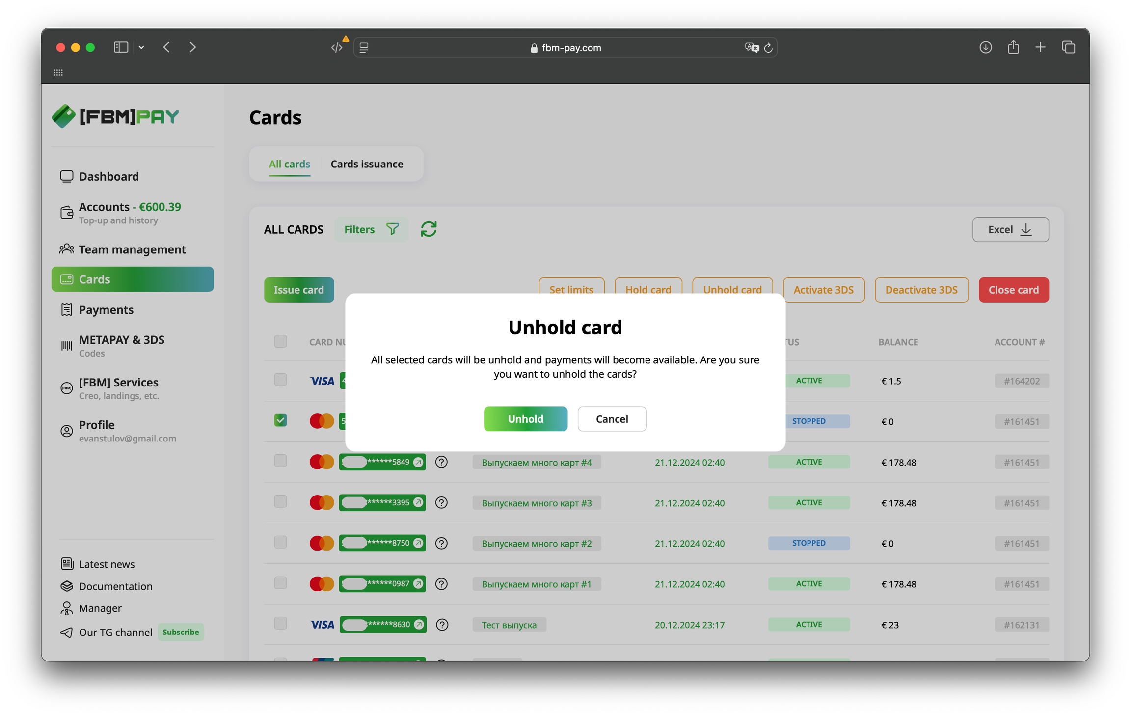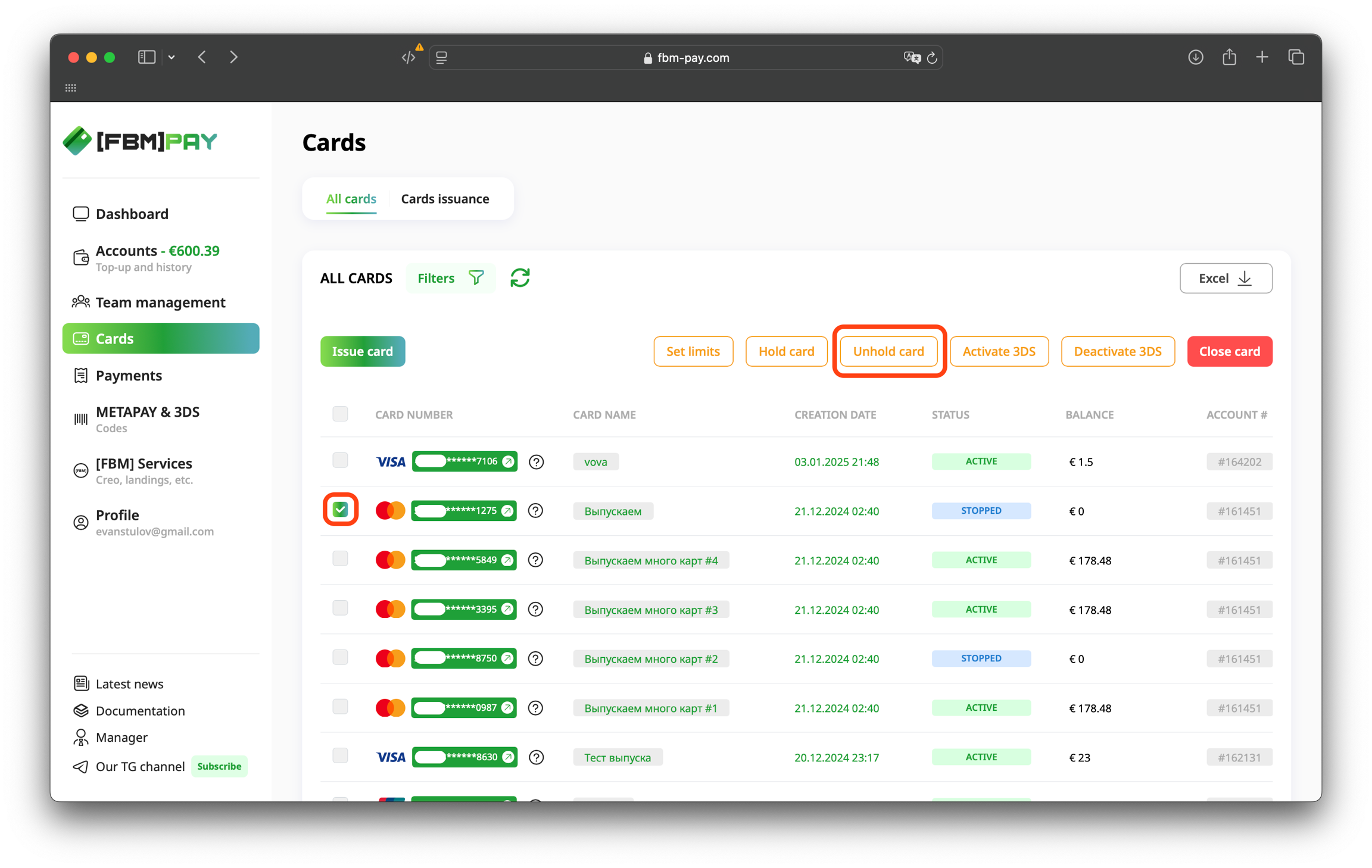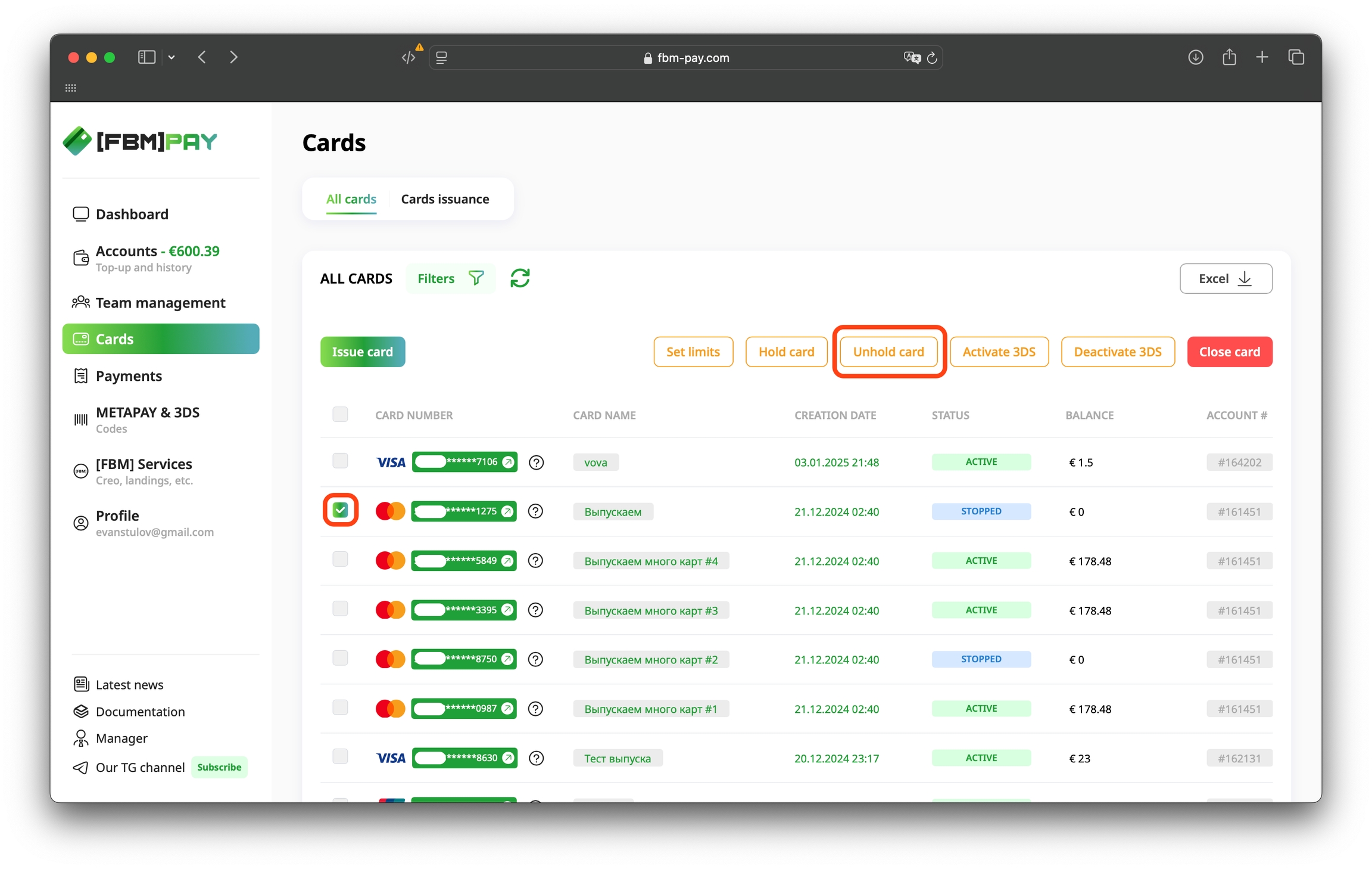 Go to the section Cards, select the desired card and click on the "Unhold card" button at the top of the work area.