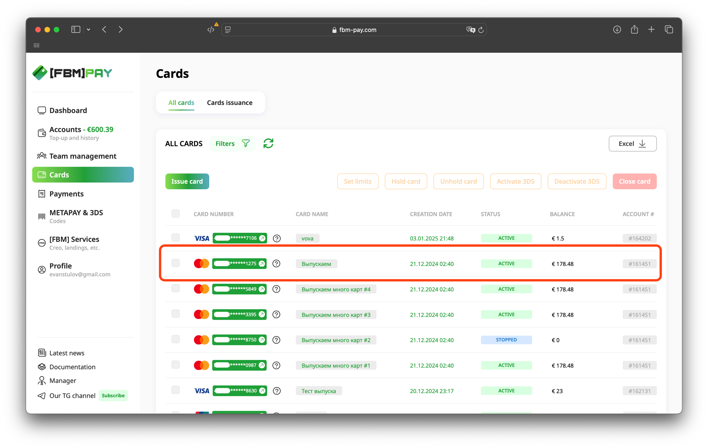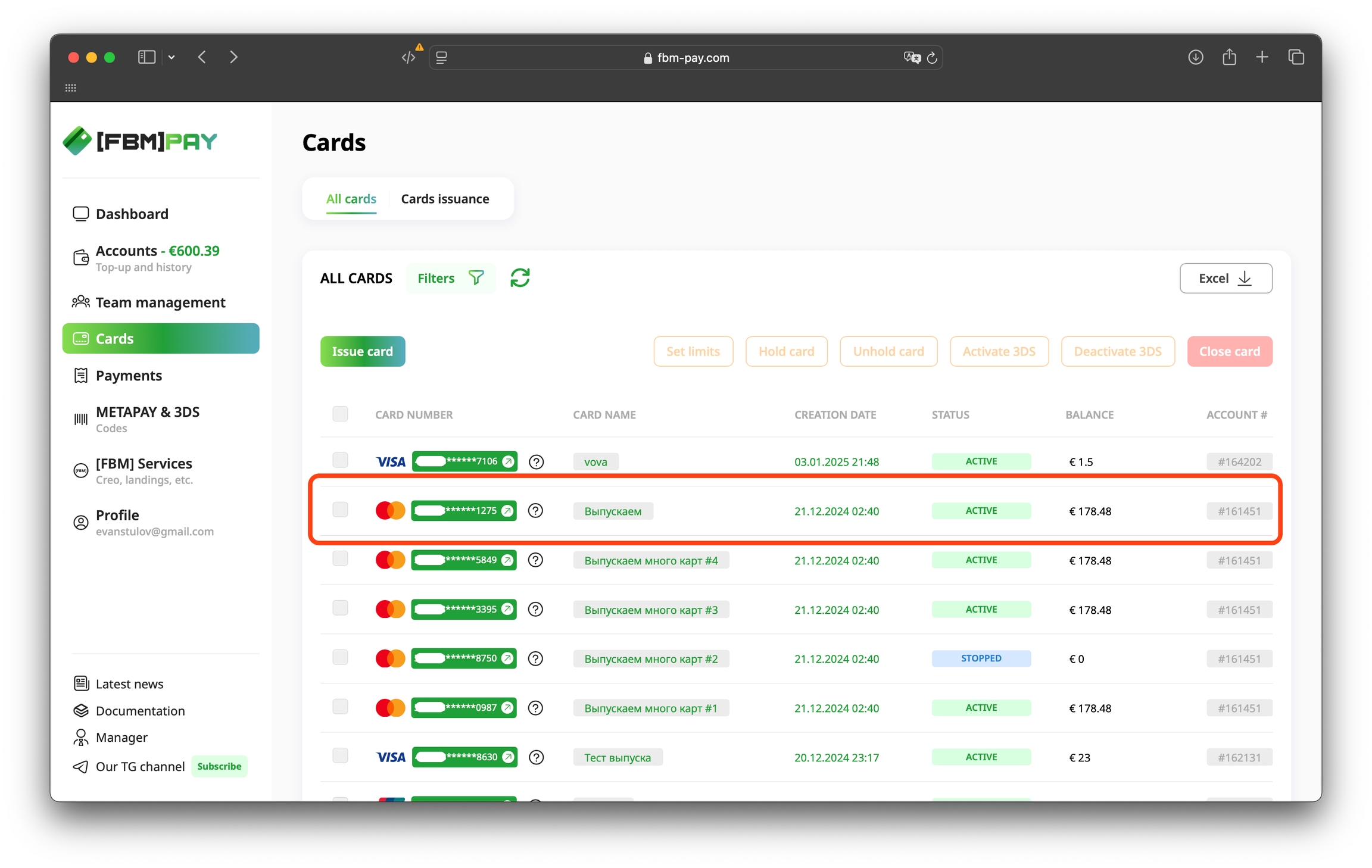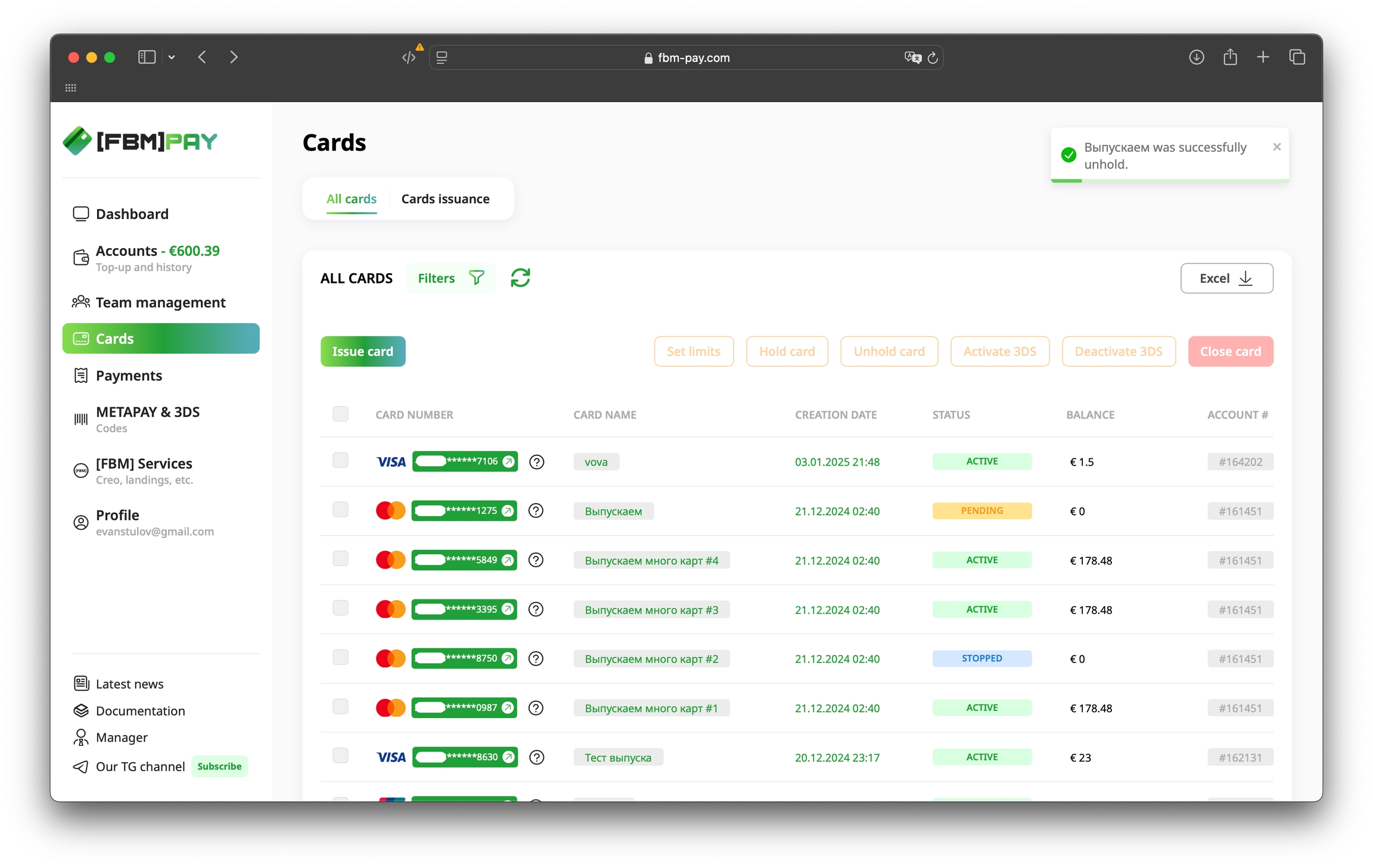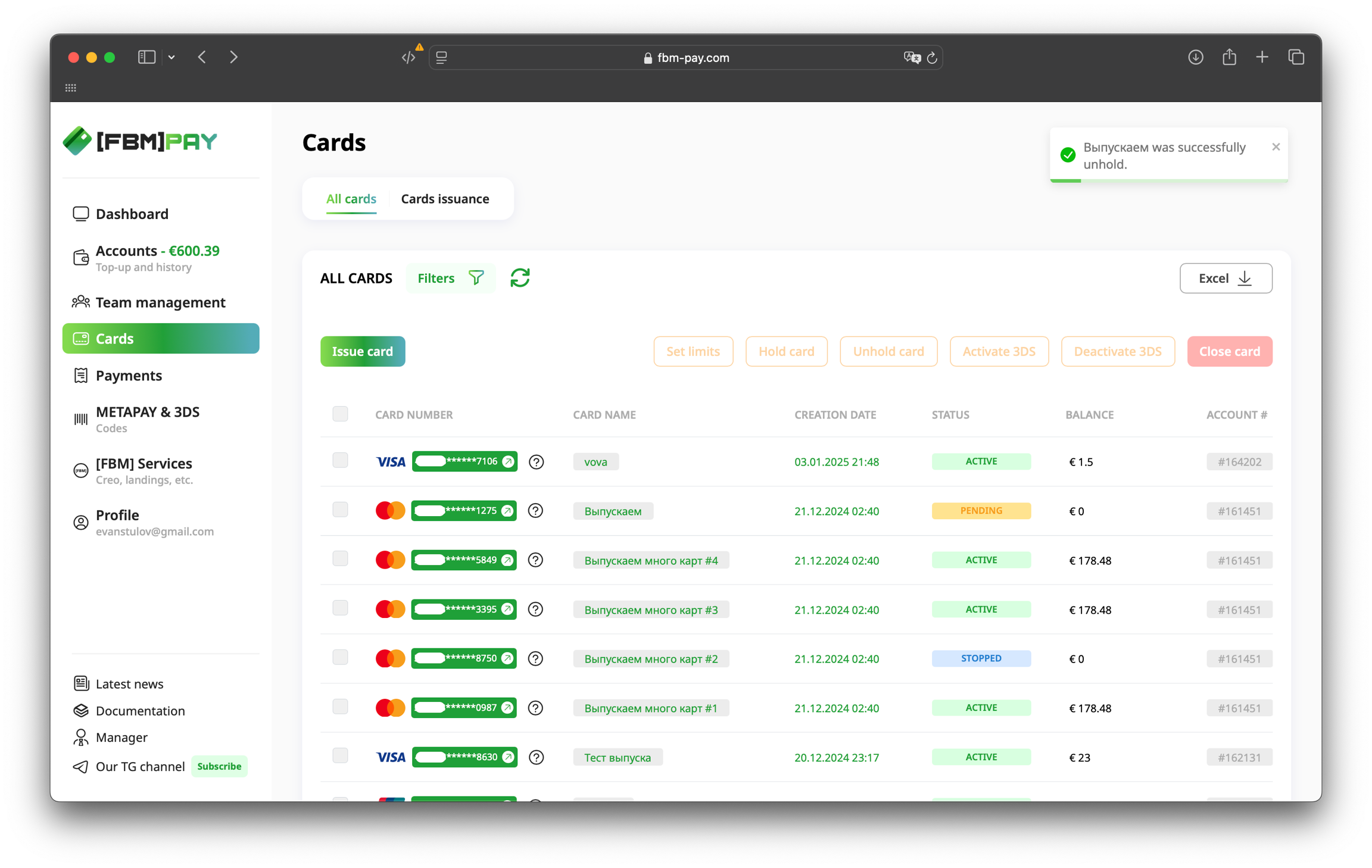 Go to the section Cards, select the desired card and click on the "Unhold card" button at the top of the work area.