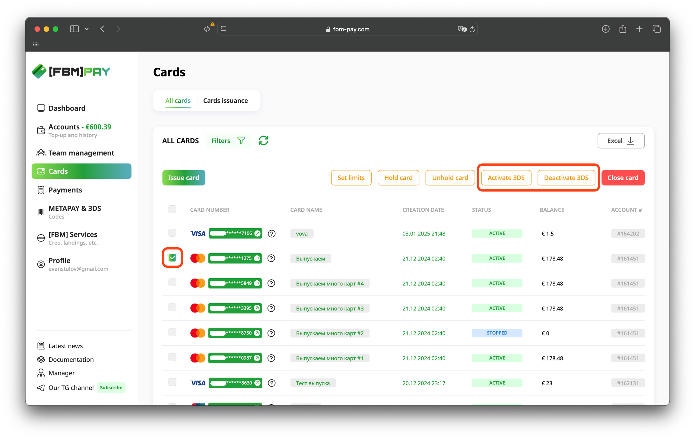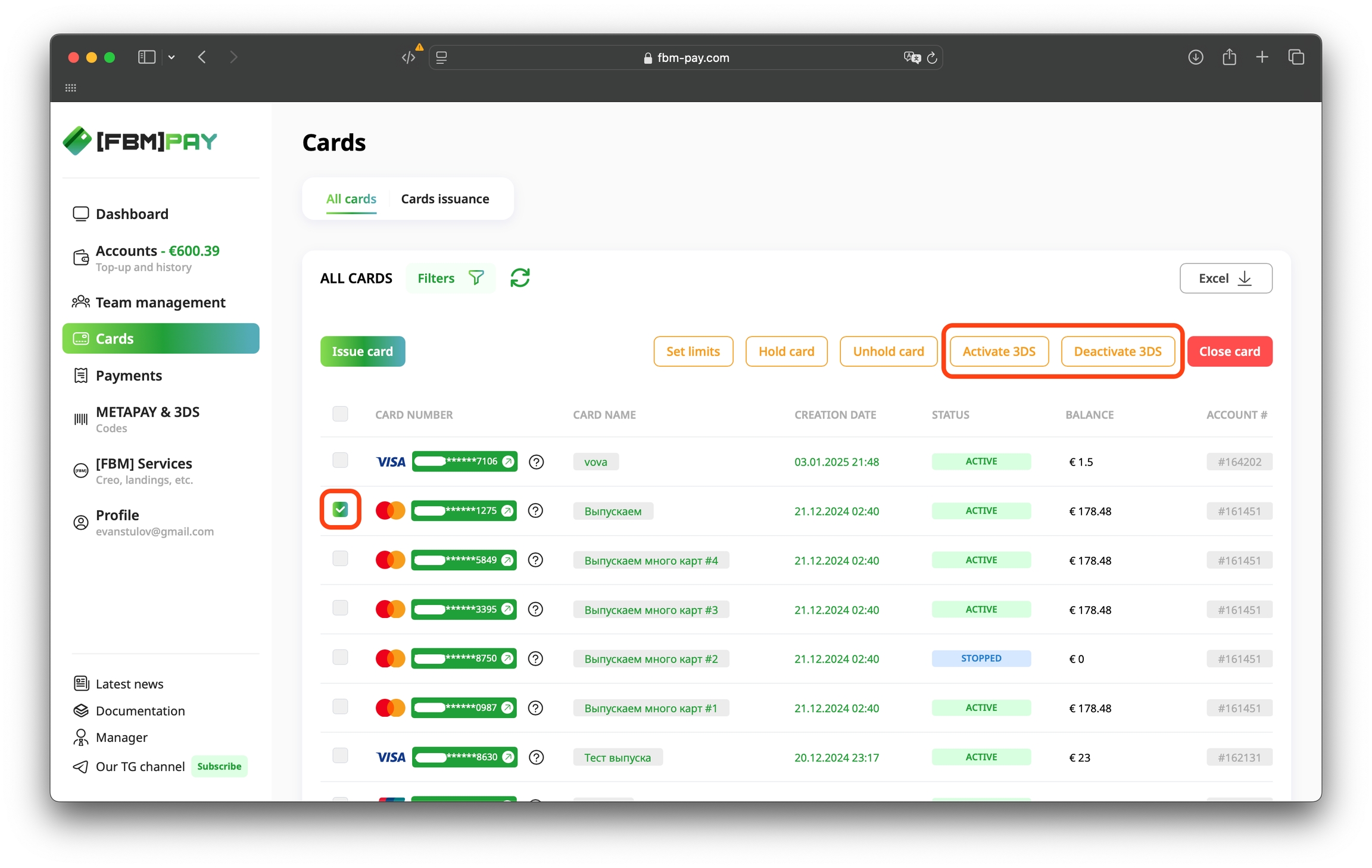 Go to the section Cards, select the appropriate card and click on the "Activate 3DS" or "Deactivate 3DS" button, depending on your goal. Then confirm the action in the window that opens.