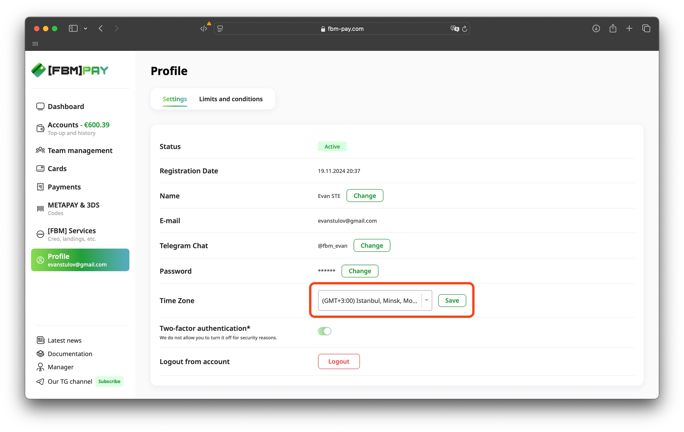 To change the time zone, go to the section Profile, select the one you want and click "Save".
